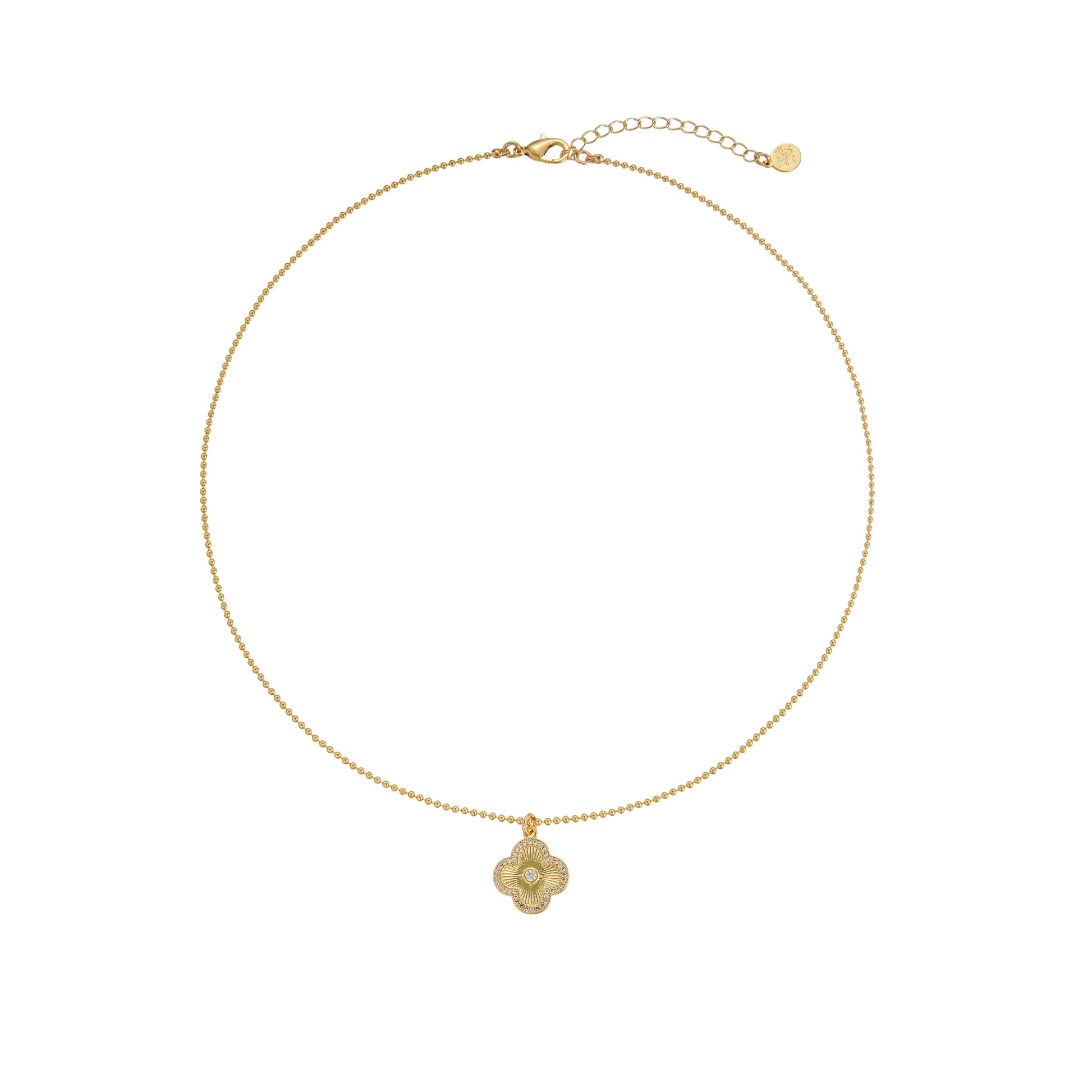 The Radiant Clover Necklace features a sculpted clover silhouette framed in delicate pavé stones, with a luminous center set against subtle sunburst detailing. Suspended from a fine gold beaded chain, it catches the light beautifully while remaining effortless enough for everyday wear.